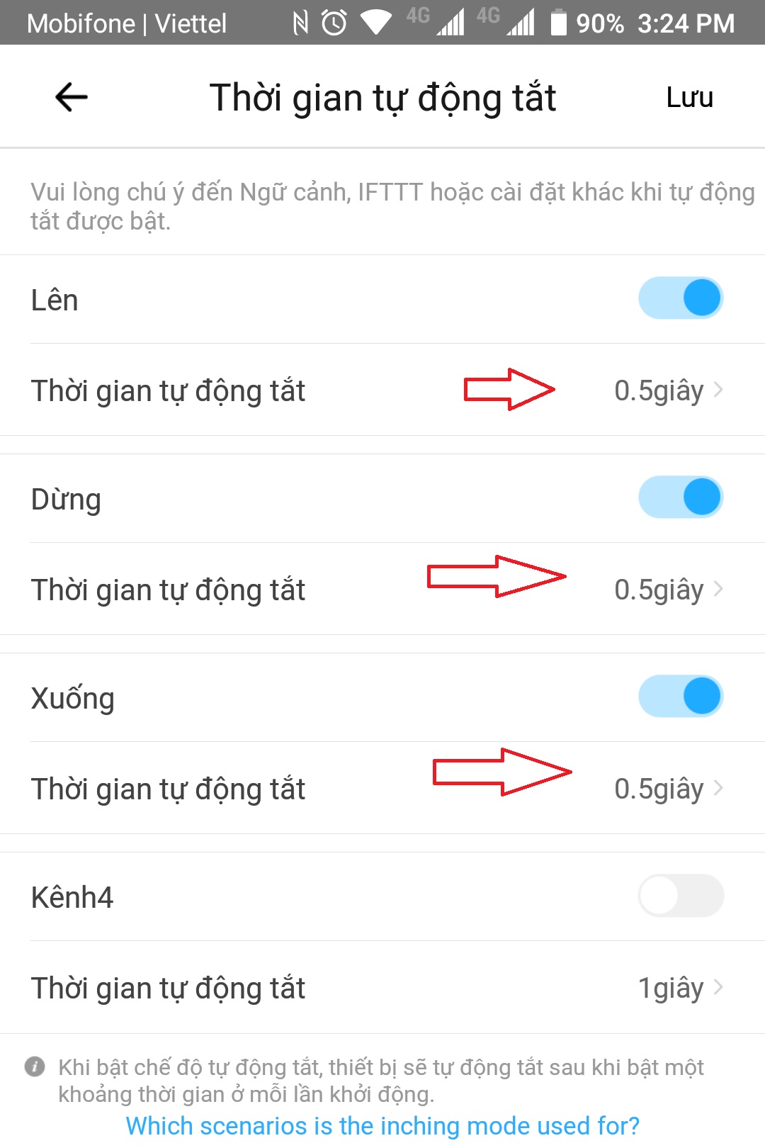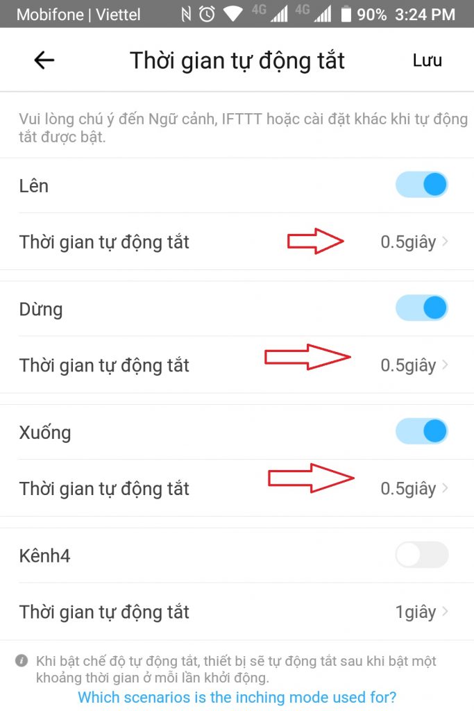 Thông thường các nút của công tắc cơ Cửa cuốn hoạt động theo nguyên tắc Nhấn và Nhả ngay nên bạn cần cấu hình cho các nút của Sonoff M5 tự động Tắt ( OFF ) sau 0.5 giây – 1 giây, như hình bên dưới. Bạn cấu hình và Lưu lại là nhé.
