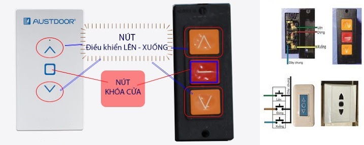 Bạn cần xác định các dây trên công tắc cửa cuốn, thông thường gồm dây Chung, dây Lên, dây Dừng, dây Xuống, như hình bên dưới.