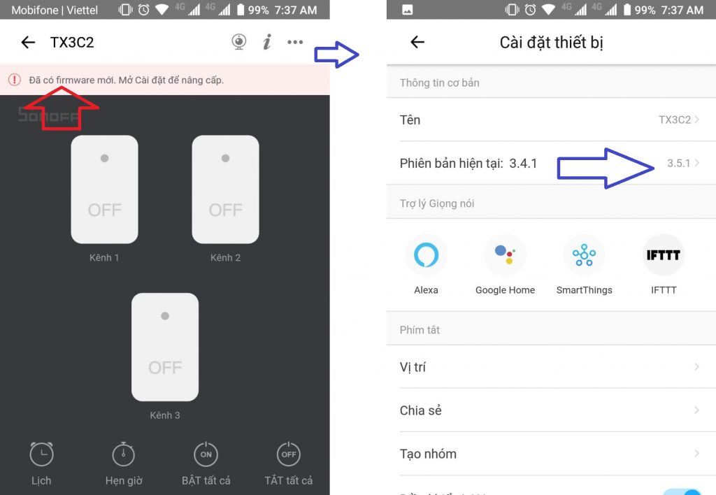 – Nếu bạn thấy dòng “Đã có firmware mới …“, bạn chọn vào nút 3 chấm của công tắc, xem phần Phiên bản hiện tại, vui lòng chọn vào để cập nhật bản mới. Quá trình cập nhật khoảng 1 phút, vui lòng KHÔNG làm mất điện công tắc nhé.