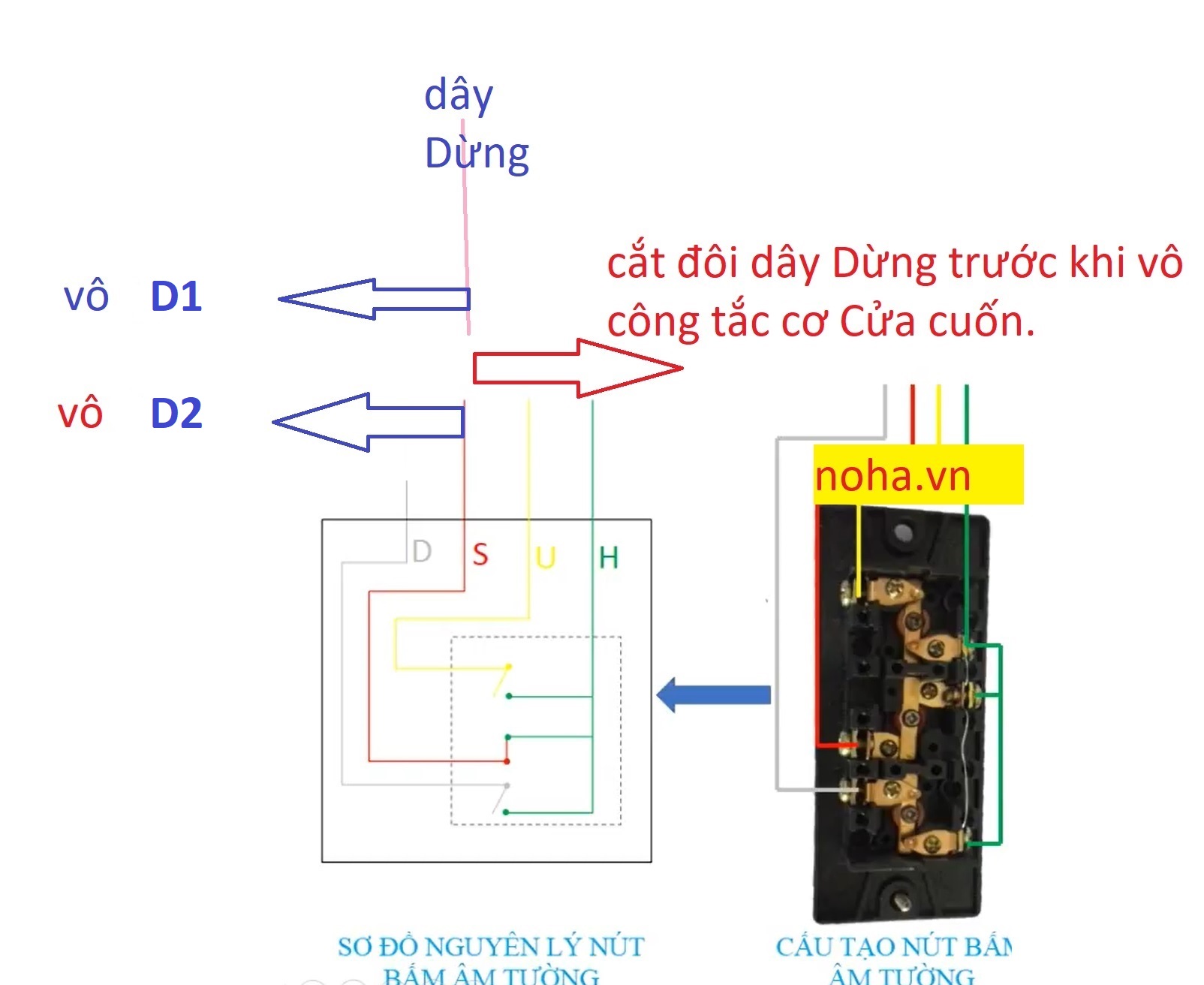 ++ Nếu bạn đấu song song với công tắc cơ cửa cuốn thì cần cắt đôi hoặc tháo dây Dừng đi xuống công tắc cơ, sau đó đầu trên đấu vô D1, đầu dưới đấu vô cổng D2.