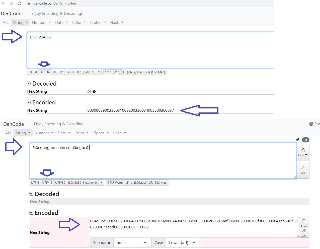 Để gửi tin có dấu, bạn cần chuyển ( encode ) số điện thoại và tin nhắn sang Uninode 16bit. Bạn truy cập vào link này để thực hiện chuyển sang Unicode.
